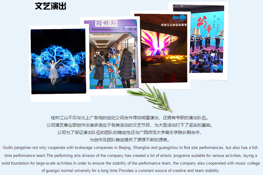 桂林江山會議會展有限責公司是一家專業(yè)的MICE公司;是傳統(tǒng)服務與信息技術相結合的科技型公司。 公司立足于線下活動的豐富經(jīng)驗,堅持運用信息技術為各類活動(項目)提供更優(yōu)質(zhì)與便捷的管理與服務。公司開發(fā)的《冬瓜云服務與管理系統(tǒng)》《雙線展覽平臺》《注冊通》《報到通》《多點位全景直播平臺》等應用軟件處于行業(yè)領先地位。桂林江山會議是一個大家庭,于2012年創(chuàng)立,經(jīng)過長期的經(jīng)營,吸納與培訓了大批關于會務服務、設計創(chuàng)意、公關演藝、會獎活動、信息技術等項目的眾多專業(yè)人材,涉及展覽工程搭建、慶典活動策劃、影視制作與直播、大型文藝演出、會獎旅游、H5、小程序等軟件的開發(fā)等眾多業(yè)務。江山會議由一支具有超前的營銷理念并...